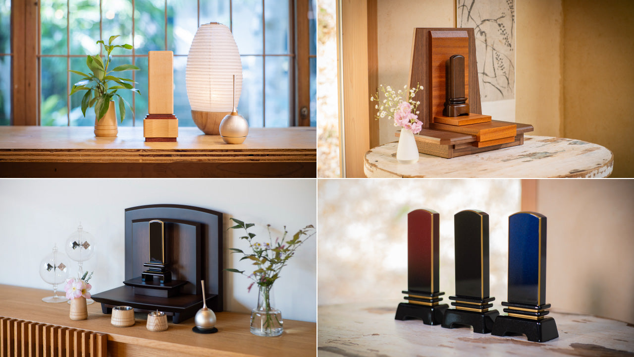 夏の深まりとともに、心を落ち着けてご先祖様をお迎えするお盆の準備を少しずつ始めてみませんか? 今回は、和モダンな住まいにも自然と馴染む「手元供養」のコーディネート例をご紹介します。中心となるお位牌「二重呂門(にじゅうろもん)」と、木のぬくもりを感じる仏具「アモーレ」、さらに音色の美しいおリン「チェリン」を組み合わせて、穏やかな祈りの空間を演出しました。 お位牌:二重呂門(溜塗) 具足:アモーレ -3具足-/木製仏具( ホワイトアッシュ) おリン:チェリン(銀色) 端正で格調高い佇まい お位牌「二重呂門-溜塗」 今回のコーディネートの主役は、シンプルな中にも品格を備えたモダン位牌「二重呂門」です。伝統的な呂門型を2層に重ねたデザインが奥行きを生み、落ち着いた高級感を漂わせます。今回は、深みのある赤みを帯びた艶が美しい「溜塗(ためぬり)」仕上げのものを使用。光の加減によって黒にも赤にも見える独特の色合いが、空間に静かな気品を添えます。和の趣を残しつつ、現代的な住まいにも自然と溶け込む佇まいです。 木のぬくもりと調和する仏具「アモーレ」 お位牌のまわりには、木のぬくもりを感じさせる仏具「アモーレ」の花瓶を合わせました。ホワイトアッシュ材のやさしい木目とシンプルなフォルムが、和モダン空間に自然な温かみを添えています。 お盆の風情を添える盆提灯 お盆の期間、ご先祖様の霊が迷わず家に帰れるようにと灯される「盆提灯」は、お盆の象徴的なアイテムです。昔から伝わる伝統的な明かりは、現代ではコンパクトで和モダンなデザインも増え、住まいの雰囲気に合わせて選べるようになりました。提灯の柔らかな灯りは、祈りの空間に温かみとやすらぎをもたらし、ご先祖様を迎える心を豊かに彩ります。 さらに、音の余韻が美しいおリン「チェリン」も添えて、静かで穏やかな祈りの空間に仕上げました。 空間を変えて、もうひとつの演出 別の部屋では、お位牌は同じ「二重呂門」を使用し、仏具「アモーレ」の花立・香炉・火立の三具足を揃えて並べています。提灯や花も変えて、異なる和モダンの祈りの空間を演出しました。三具足が揃うことで、より統一感のあるしつらえとなり、ホワイトアッシュの温もりが際立ちます。 和モダン空間で実現する、お盆の祈りのしつらえ 今回ご紹介したのは、和モダンな住まいに自然と馴染む、手元供養のコーディネート例です。端正なお位牌と、木のぬくもりを感じる仏具の組み合わせが、心穏やかな祈りの時間をやさしく包み込みます。ご先祖様をお迎えするこの特別な季節に、暮らしに寄り添う祈りの空間づくりのヒントとなりましたら幸いです。