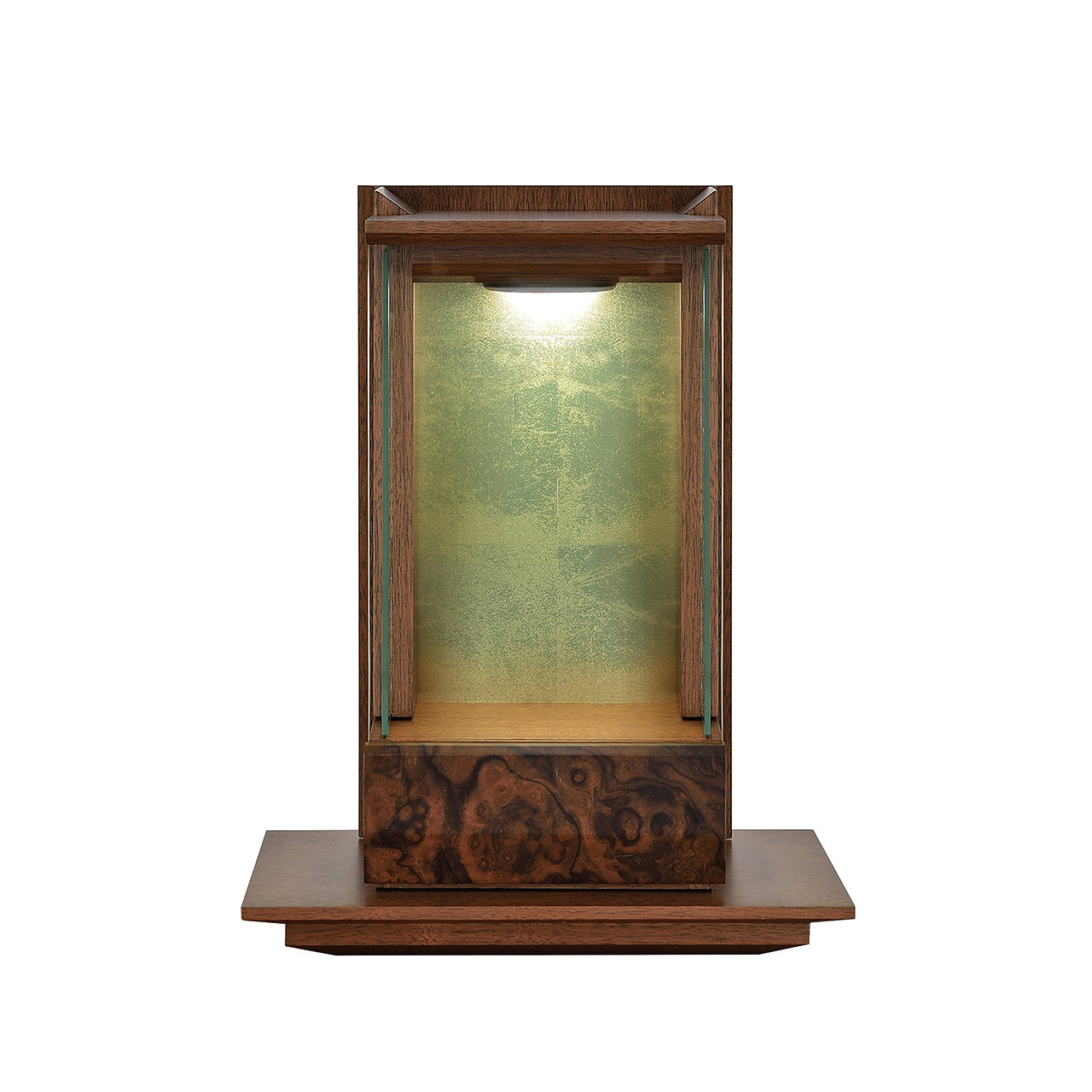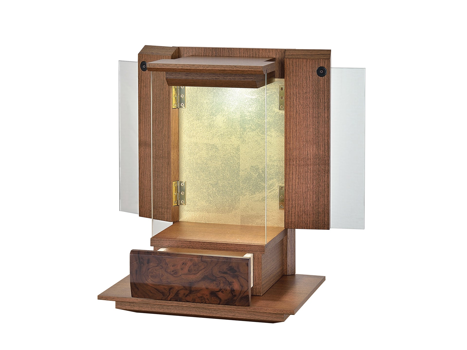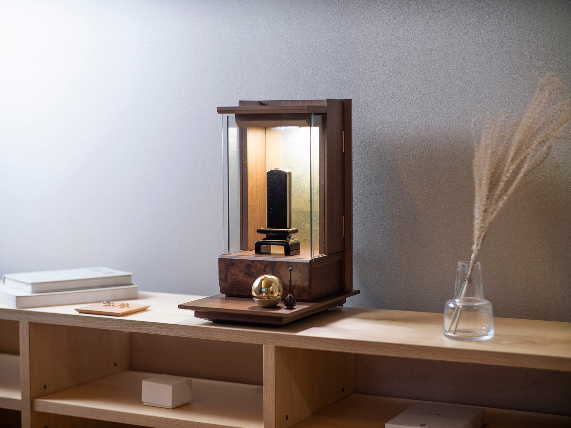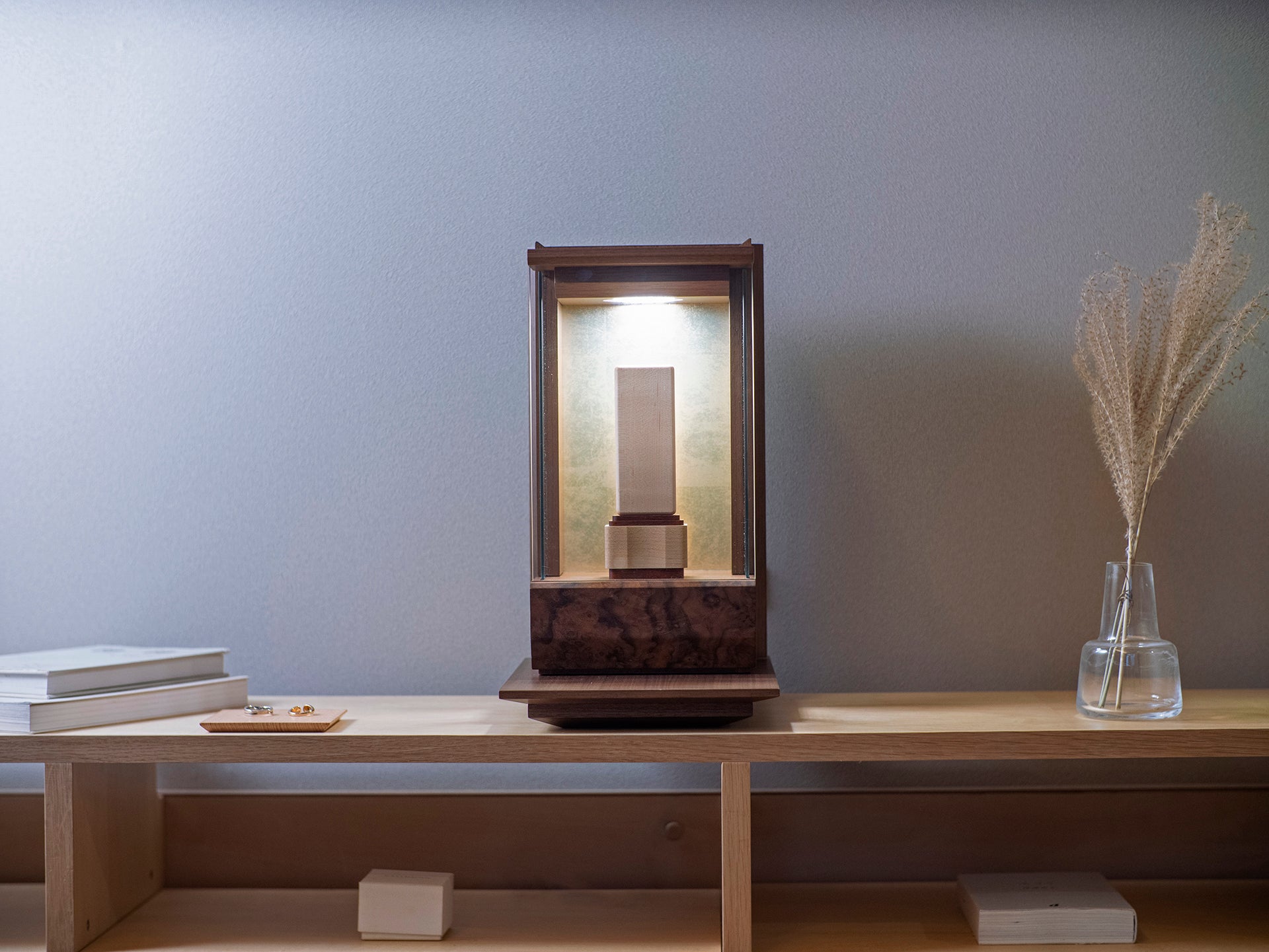 ウォールナットの深い風合いを生かした、品格と落ち着きを備えた佇まい。素材の質感とモダンな要素が調和した、静かでシンプルな手元供養ステージです。