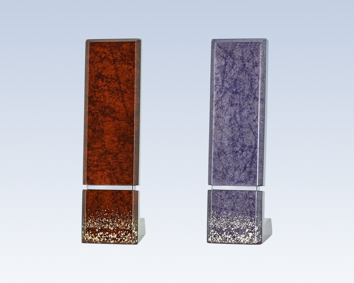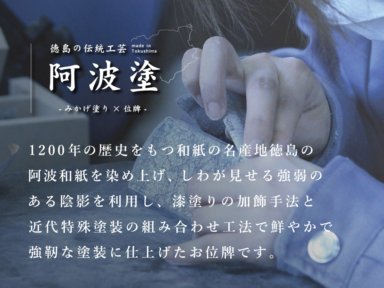 1200年の歴史をもつ和紙の名産地徳島の阿波和紙を染め上げ、しわが見せる強弱のある陰影を利用し、漆塗りの加飾手法と近代特殊塗装の組み合わせ工法で鮮やかで強靭な塗装に仕上げたお位牌です。