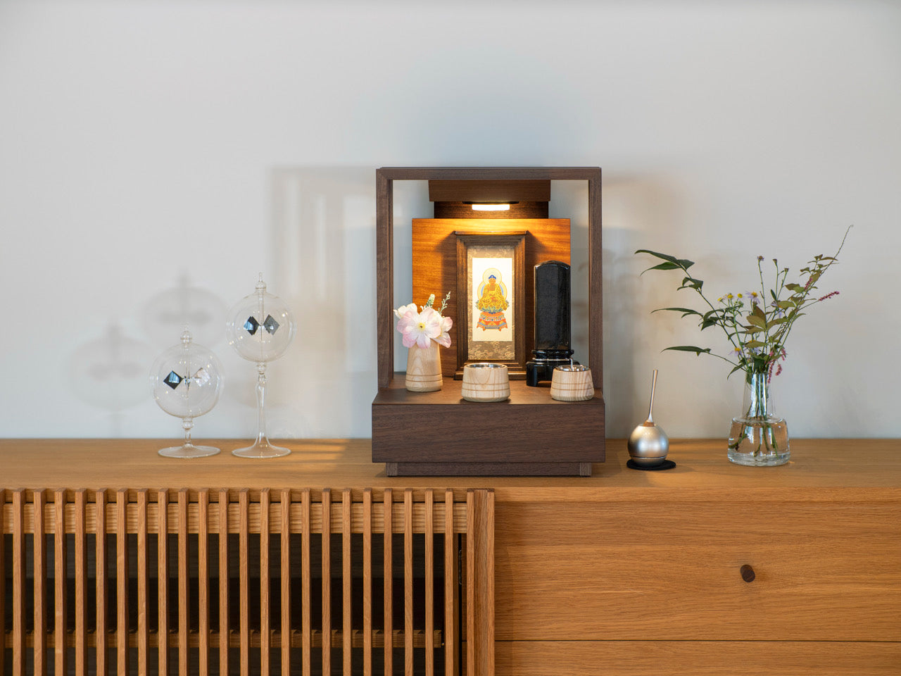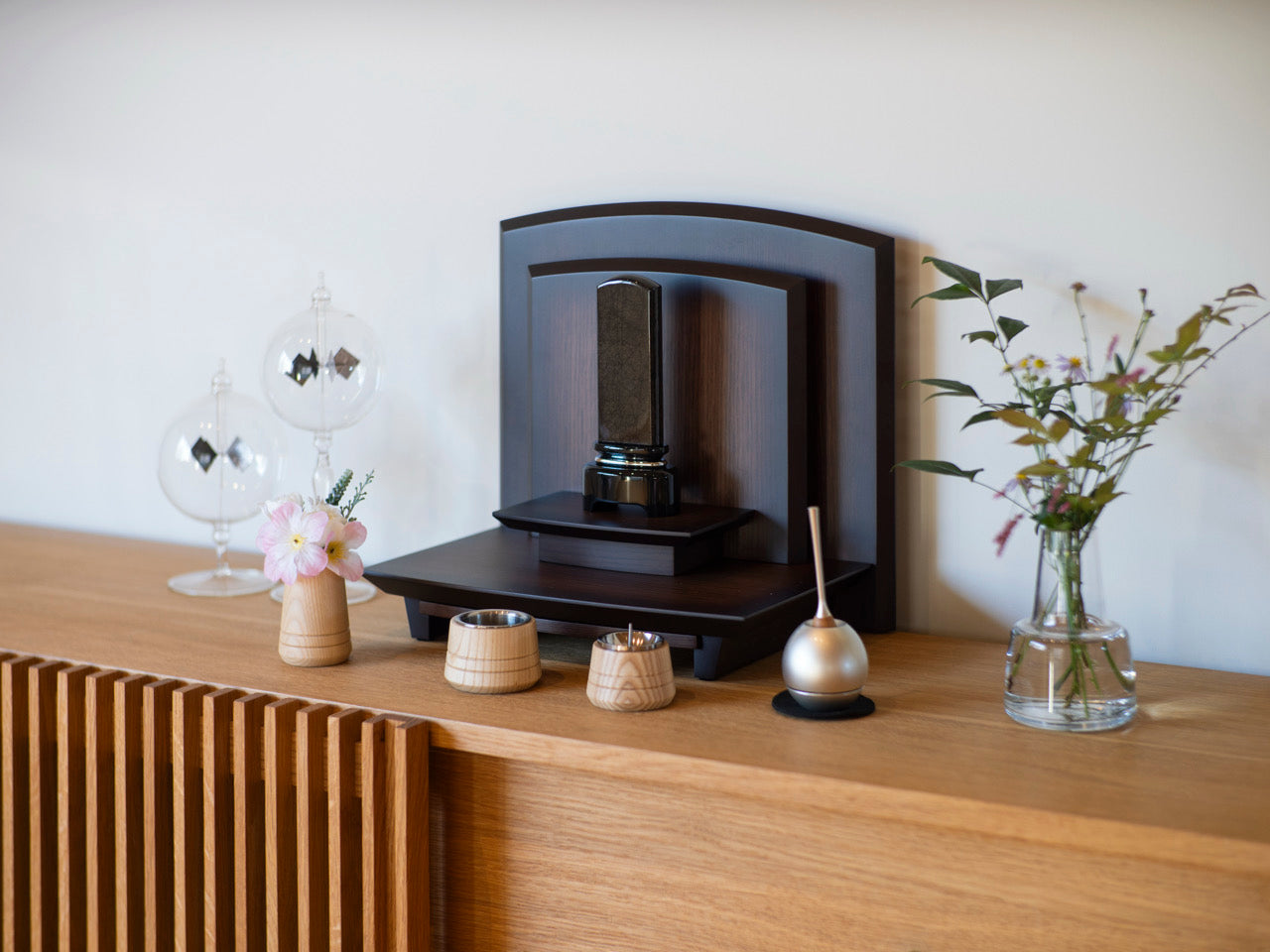ウォールナットなどを使用したモダンタイプのミニ仏壇やステージでも、お位牌自体の存在感がしっかりと感じられ、バランスの取れたお祀りの場にすることが可能です。
